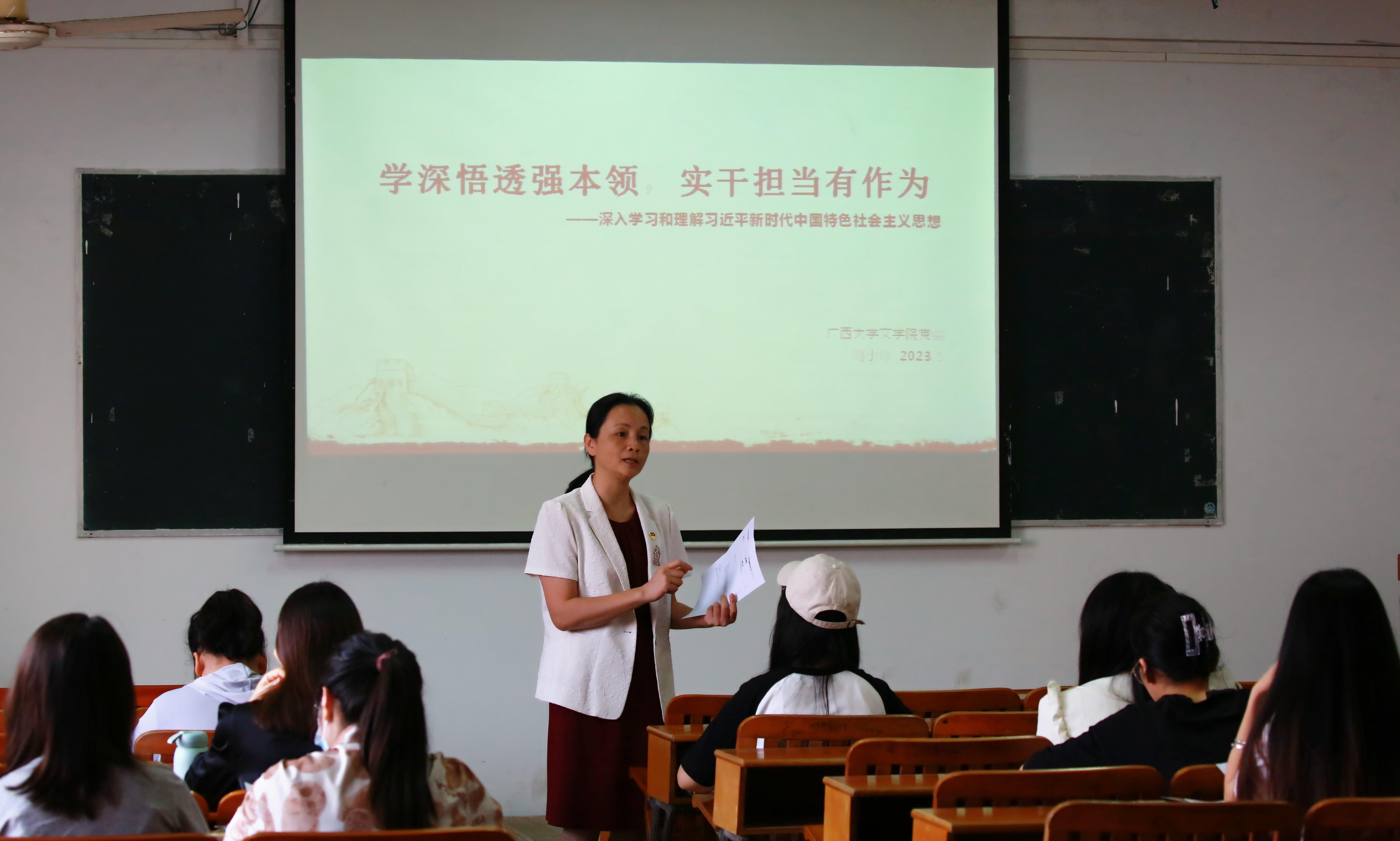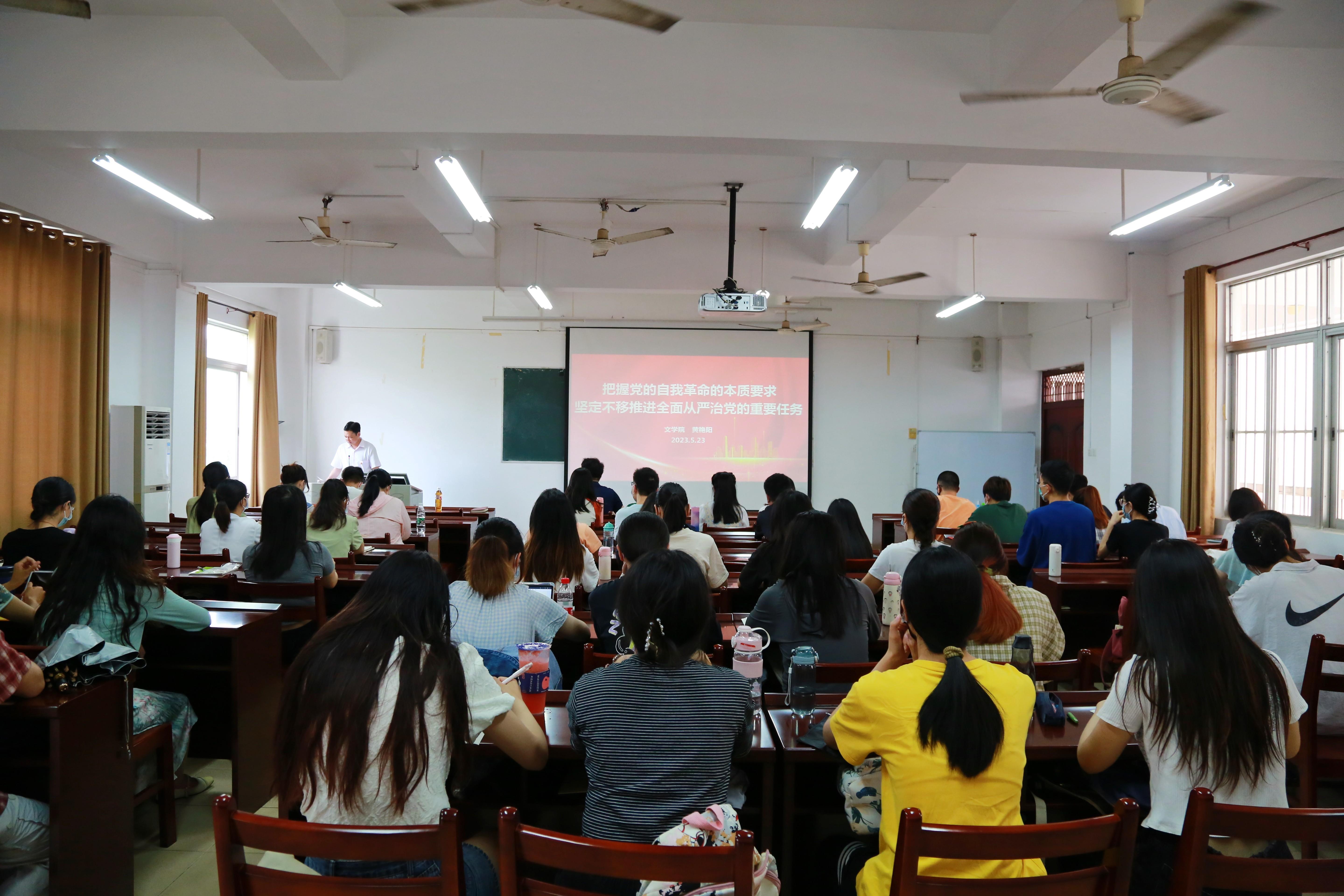 党委书记胡小坤同志以《学深悟透强本领,实干担当有作为——深入学习和理解习近平新时代中国特色社会主义思想》为题,为教工第一党支部、汉教本科党支部毕业班党员、文学研究生党支部讲专题党课。党委副书记、院长孙瑞同志以《学好习近平新时代中国特色社会主义思想,增强党性修养》为题,为语言学研究生党支部专题党课。党委副书记、纪委书记郭爱涛同志《学习贯彻习近平新时代中国特色社会主义思想,做新时代忠诚干净担当好党员》为题,为文学本科一支部、汉教研究生二支部讲专题党课。党委委员、副院长田春来同志以《研究生党员如何发挥模范带头作用》为题,为汉教研究生一支部讲专题党课。党委委员、副院长阳静同志以《以时代精神激活中华优秀传统文化的生命力》为题,为教工第二党支部讲专题党课。副院长黄艳阳同志以《把握党的自我革命的本质要求,坚定不移推进全面从严治党的重要任务》为题,为文学本科二支部、汉教本科党支部非毕业班党员讲专题党课。