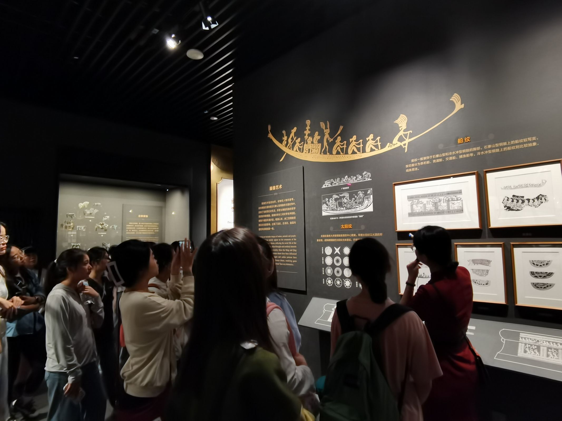 馆内运用多种科技技术展示壮族的历史与文化,多方位展示壮族文化,如运用科技投影展示岩画,建立古代的壮族建筑模型,及各种壮族人们生产生活的场景复刻等,都让同学们更清晰的感受到壮族文化的壮丽,体会到壮族先民的智慧与辛勤。在讲解到壮族服饰文化时,美丽的壮锦吸引着同学们的目光,也让同学们认识到壮族文化的多彩和丰富。